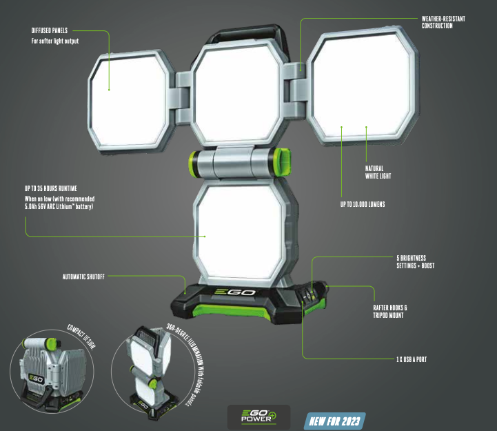 Complete with five brightness settings, foldable panels, easy transportation and storage, the EGO Power+ Portable Area Light is suitable for everything from mood lighting to task lighting.