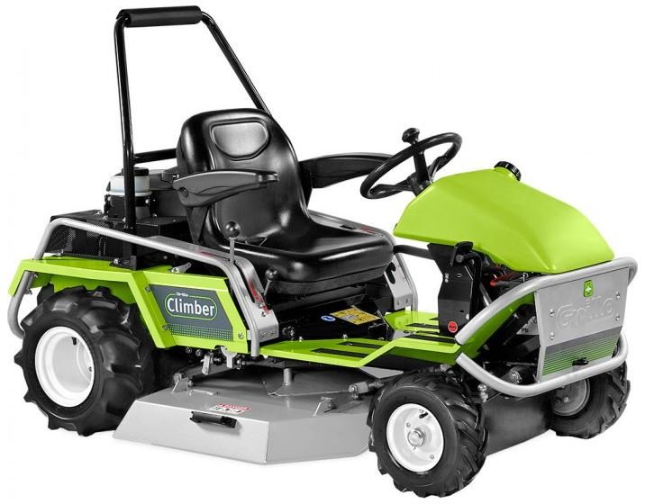 Grillo Climber 9.22 is a compact sized machine, with a low center of gravity and optimal weight distribution, built to obtain maximum stability under most conditions and allowing maximum security for the operator in working areas where there are slopes. A low positioned padded seat with arm rests gives increased safety to the operator, whilst the low mounted,vertical crank engine which is positioned over the drive unit, the centrally positioned cutter deck, exactly between the 4 wheels, as well as the tank and battery located over the front axle, makes the machine extraordinarily stable.